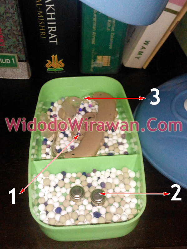 Untuk pengering sederhana ini, saya hanya memerlukan perangkat lampu belajar dengan bola lampu pijar 5 watt (nomor 4), serta wadah untuk menaruh ABD dan baterai (nomor 5). Lebih jelas, perhatikan gambar yang ada. Kondisi dan posisi ABD saat dikeringkan terlihat seperti pada gambar. Baterai dikeluarkan dari ABD (nomor 2), dan tutup tempat baterai ABD dibiarkan terbuka maksimal (nomor 1). Tubing dan earmold tidak perlu dilepas (nomor 3).
