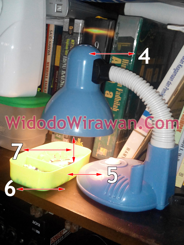 Hal yang penting adalah melakukan survei atau menilai kondisi panas yang dihasilkan oleh lampu 5 watt, serta jarak lampu ke ABD dan wadahnya (nomor 7). Ini penting, jangan sampai terlalu panas karena jarak terlalu dekat atau panasnya kurang karena jarak terlalu jauh. Pada contoh gambar, saya menggunakan lemari tertutup dengan kaca bening. Di awal percobaan dulu, saya senantiasa melihat kondisi ABD, terlalu panas apa tidak, mungkin jaraknya terlalu dekat dengan lampu. Jadi menilainya secara subjektif saja. Perhatikan juga keadaan di sekitar pengering yang mungkin membahayakan. Contoh pada saya ini tidak ideal, karena pengering ditaruh di lemari/rak penyimpanan buku, yang bisa saja menyebabkan kebakaran. Taruhlah ABD dan pengering di tempat yang tinggi, agar tidak mudah terjangkau dan disenggol oleh binatang peliharaan atau orang yang ada di rumah. Kalau memakai rak lemari, taruhlah di bagian paling atas. Seperti contoh, sebaiknya pakailah lemari kaca yang tembus pandang, agar kita bisa tahu kondisi yang terjadi saat pengering bekerja.